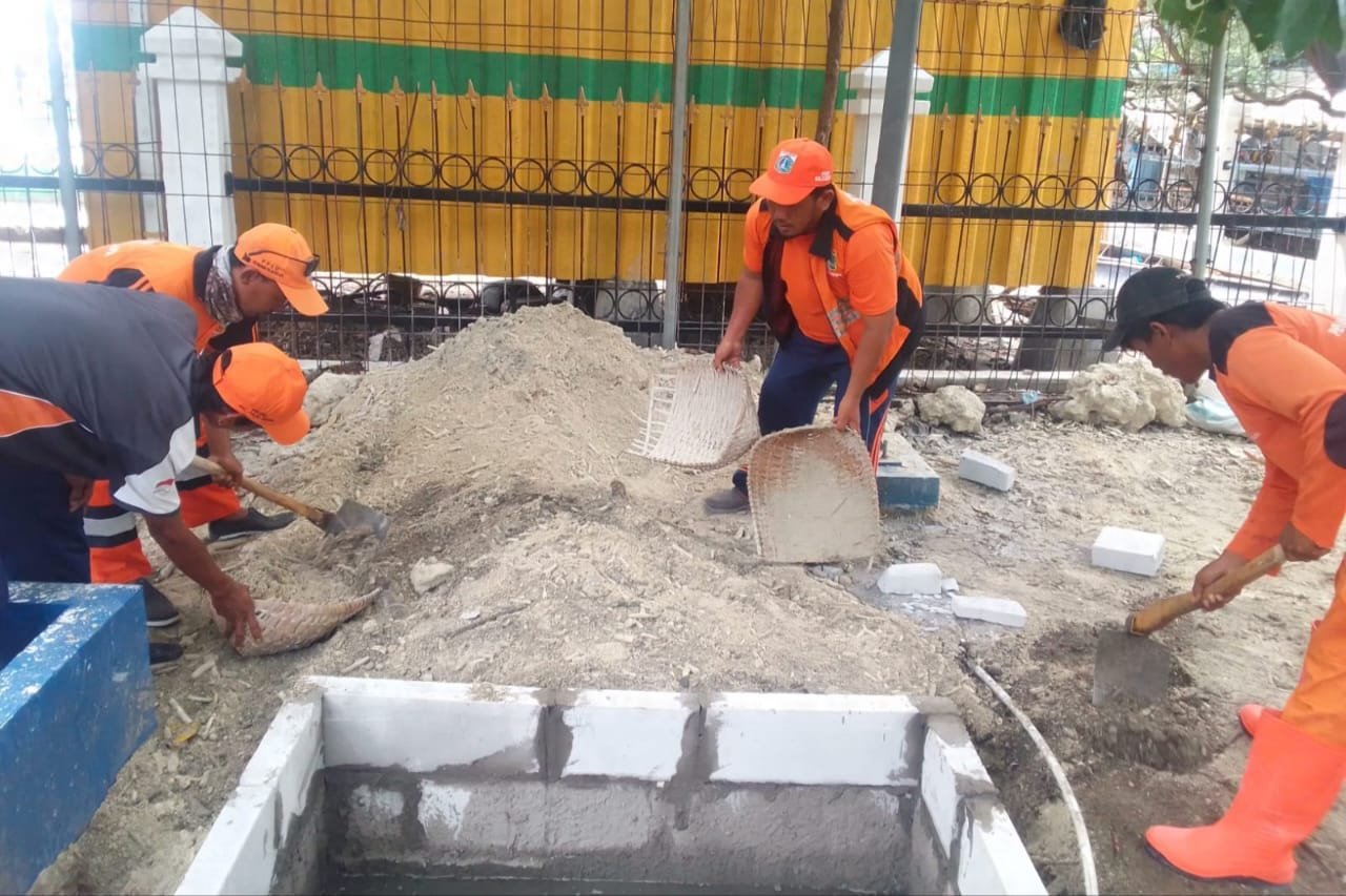 Pulau Kelapa – Petugas Penanganan Prasarana dan Sarana Umum (PPSU) Keluarahan Pulau Kelapa melakukan perbaikan paving block yang rusak di depan kantor Kelurahan Pulau Kelapa, Kecamatan Kepulauan Seribu Utara, Senin, 20 Januari 2025.