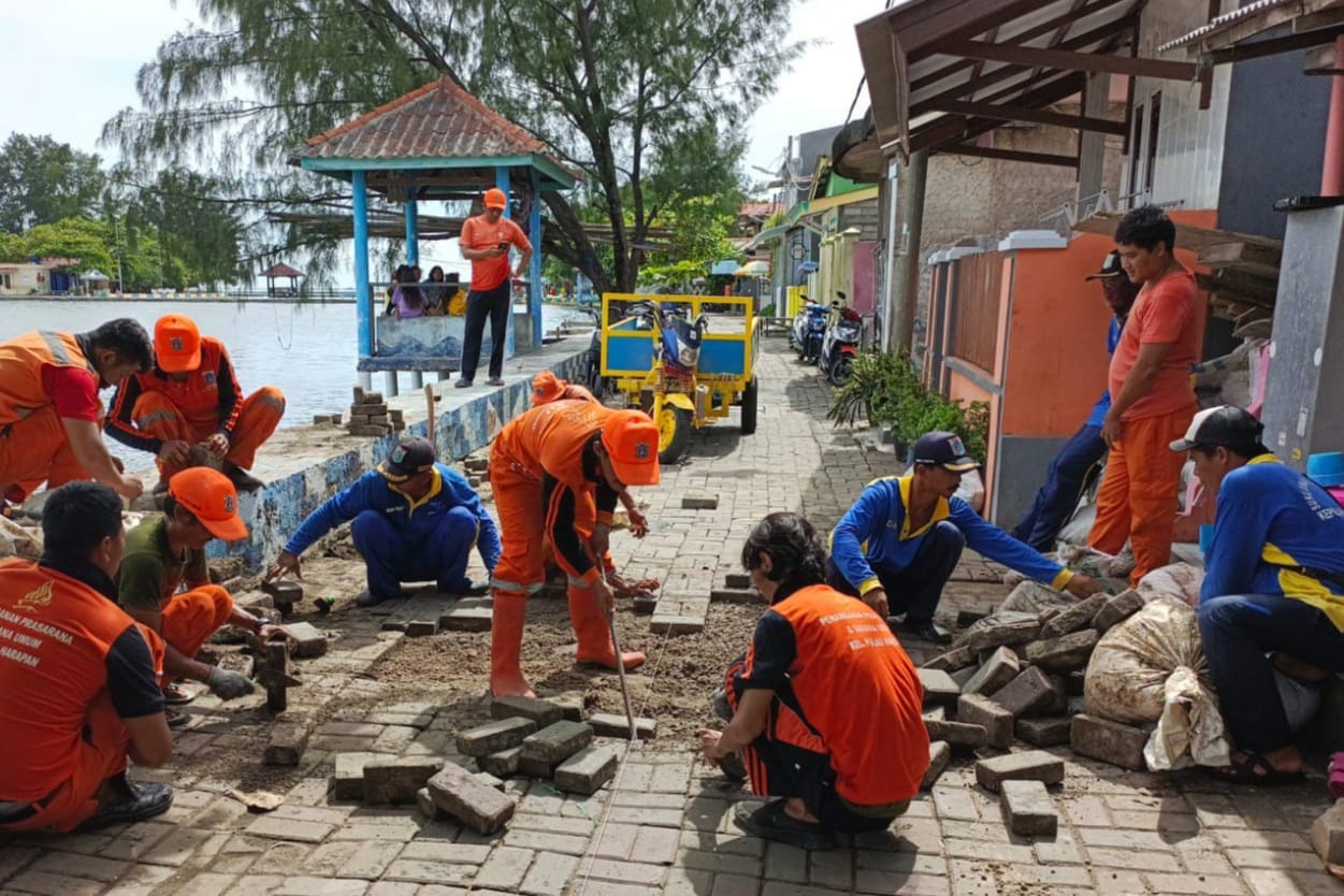Petugas Penanganan Prasarana dan Sarana Umum (PPSU) Kelurahan Pulau Harapan tanggap memperbaiki akses jalan yang rusak akibat terjangan banjir rob.