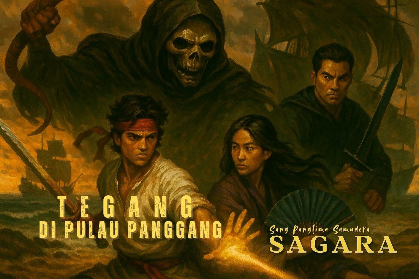 Langit di atas Pulau Panggang memerah, bukan oleh cahaya senja, tapi oleh nyala api dan debu yang mulai beterbangan saat tiga kapal bertiang hitam bersayap kelelawar merapat cepat ke dermaga tua. Di atas geladak tertinggi, Kurwatala—Bayangan Tengkorak Merah—berdiri membatu.